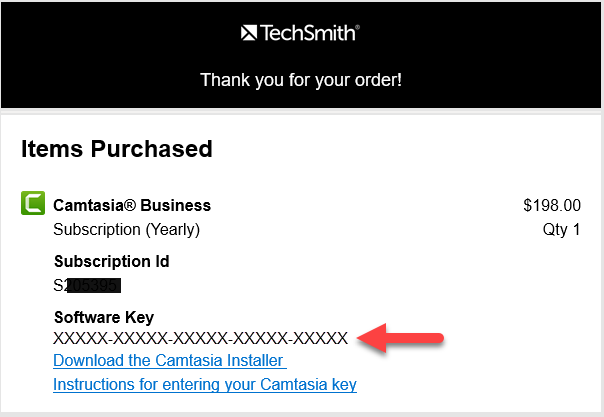 If you purchased an individual license subscription for Snagit or Camtasia, you will not receive a software key. Log in to the product with the email address used during purchase.