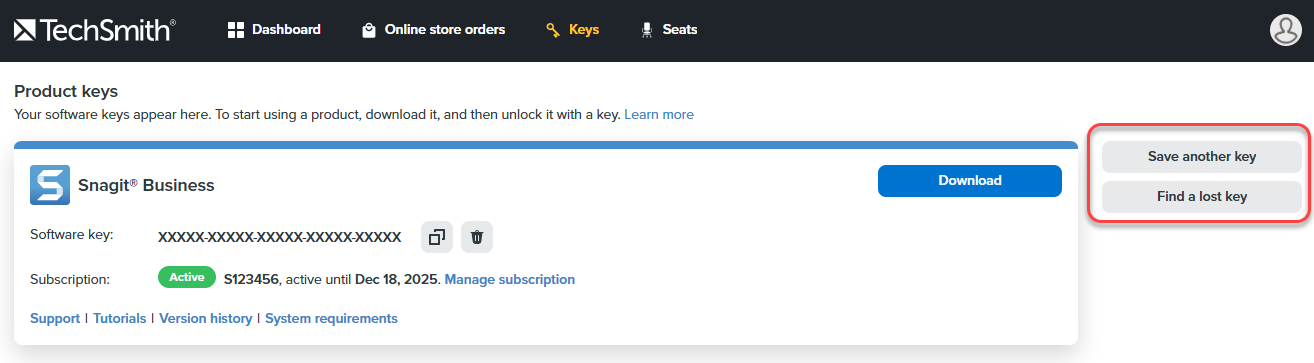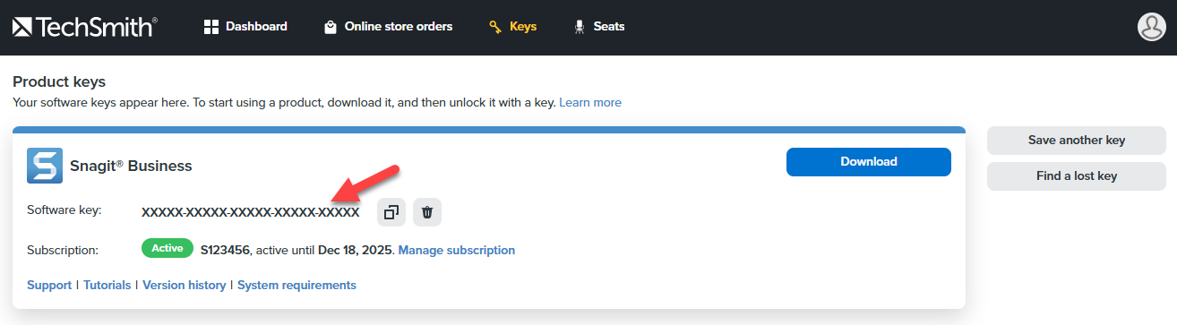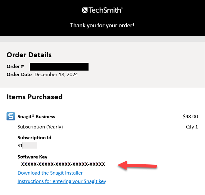 If you purchased an individual license subscription for Snagit or Camtasia, you will not receive a software key. Log in to the product with the email address used during purchase.