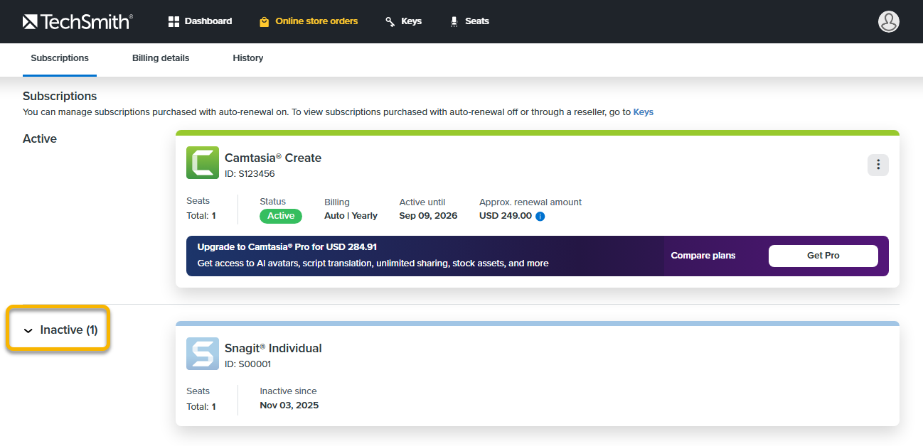 NOTE: If your Snagit subscription was set to renew after your Camtasia Plan, we've extended your Camtasia Plan renewal date to match the later Snagit date.