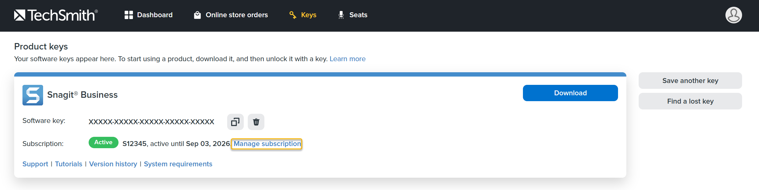 If you have a software key-based Snagit subscription, we have not made any changes to your active Snagit Business License software key. Business License keys are still transferable, and you can view this subscription under Keys in your TechSmith account